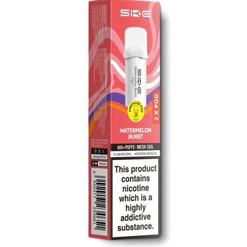 SKE 600 Pro Watermelon Burst pods are designed for use with the SKE 600 Pro device, offering a smooth and flavour-packed vape with zero mess or maintenance. Each pod features a fixed 1.1ohm mesh coil and comes prefilled with 2ml of 20mg nicotine salt e-liquid, delivering a consistent Mouth-to-Lung vape with every puff.